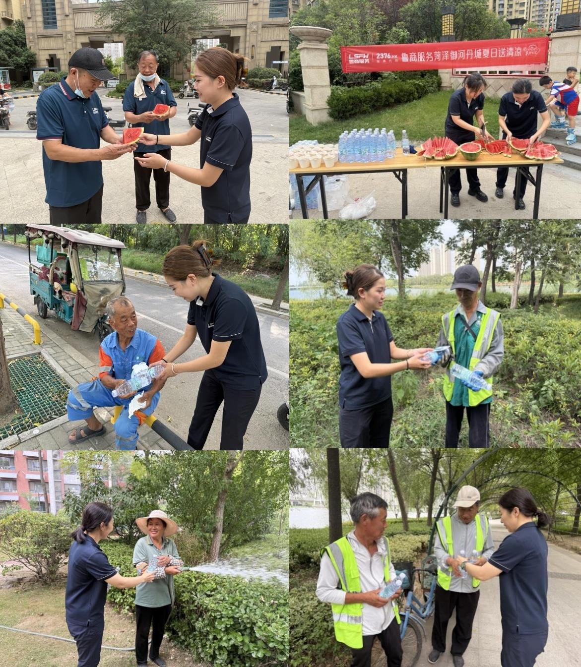魯商服務(wù)各項(xiàng)目還特別關(guān)注環(huán)衛(wèi)工人群體,菏澤鳳凰城和御河丹城項(xiàng)目在小區(qū)門(mén)口組織專(zhuān)人將解暑西瓜、礦泉水送到一線,為環(huán)衛(wèi)工人遞上冰鎮(zhèn)瓶裝水,還細(xì)心將新鮮西瓜切塊分裝,讓大家在高溫中能歇腳解渴。環(huán)衛(wèi)工李師傅感動(dòng)地說(shuō):“這么熱的天能吃上西瓜,心里是真涼爽!”