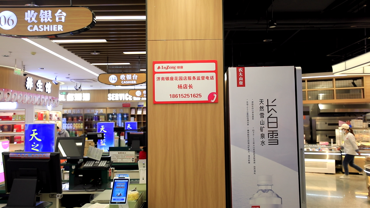 這讓筆者很難相信。直到看到了他們店里一個地方:在一樓收銀處的柱子上,一串大大的電話號碼赫然醒目,上面寫著“濟(jì)南銀座花園店服務(wù)監(jiān)督電話楊店長”的字樣。
